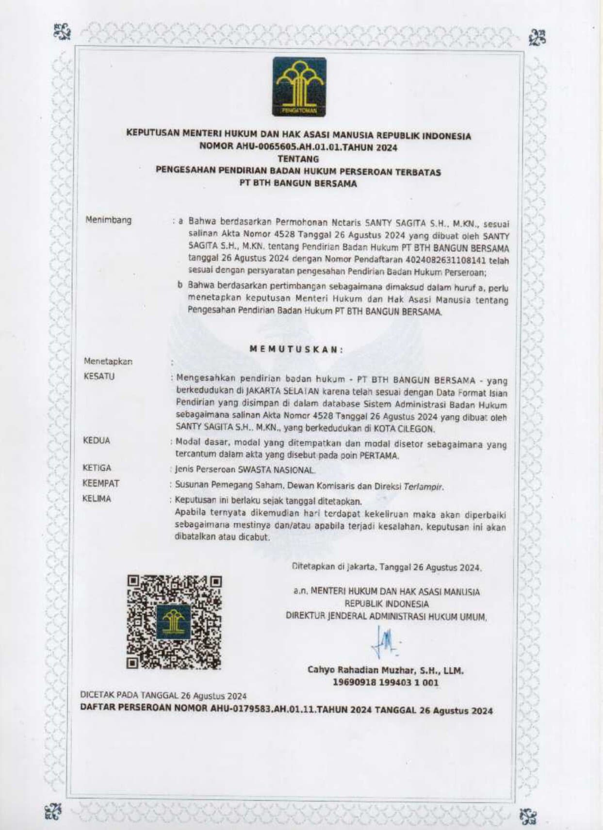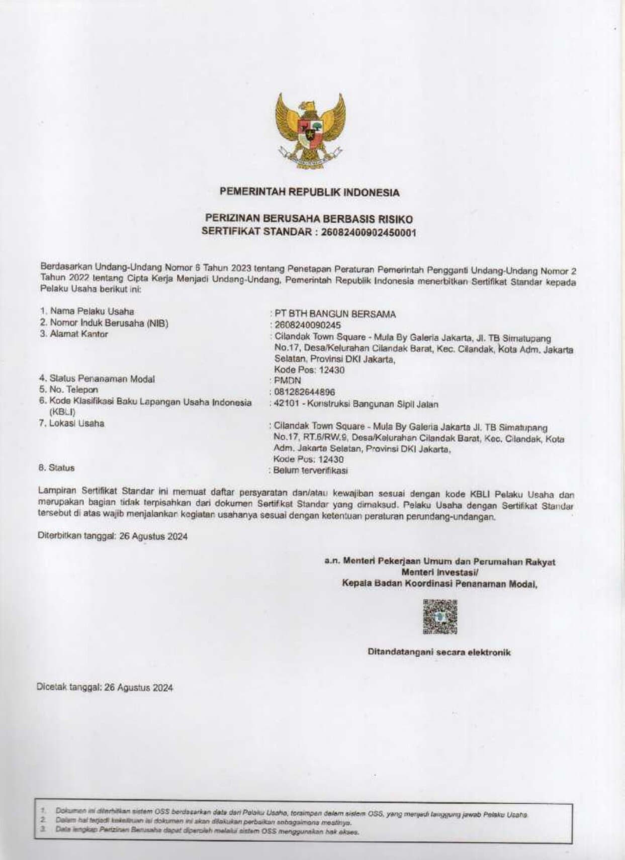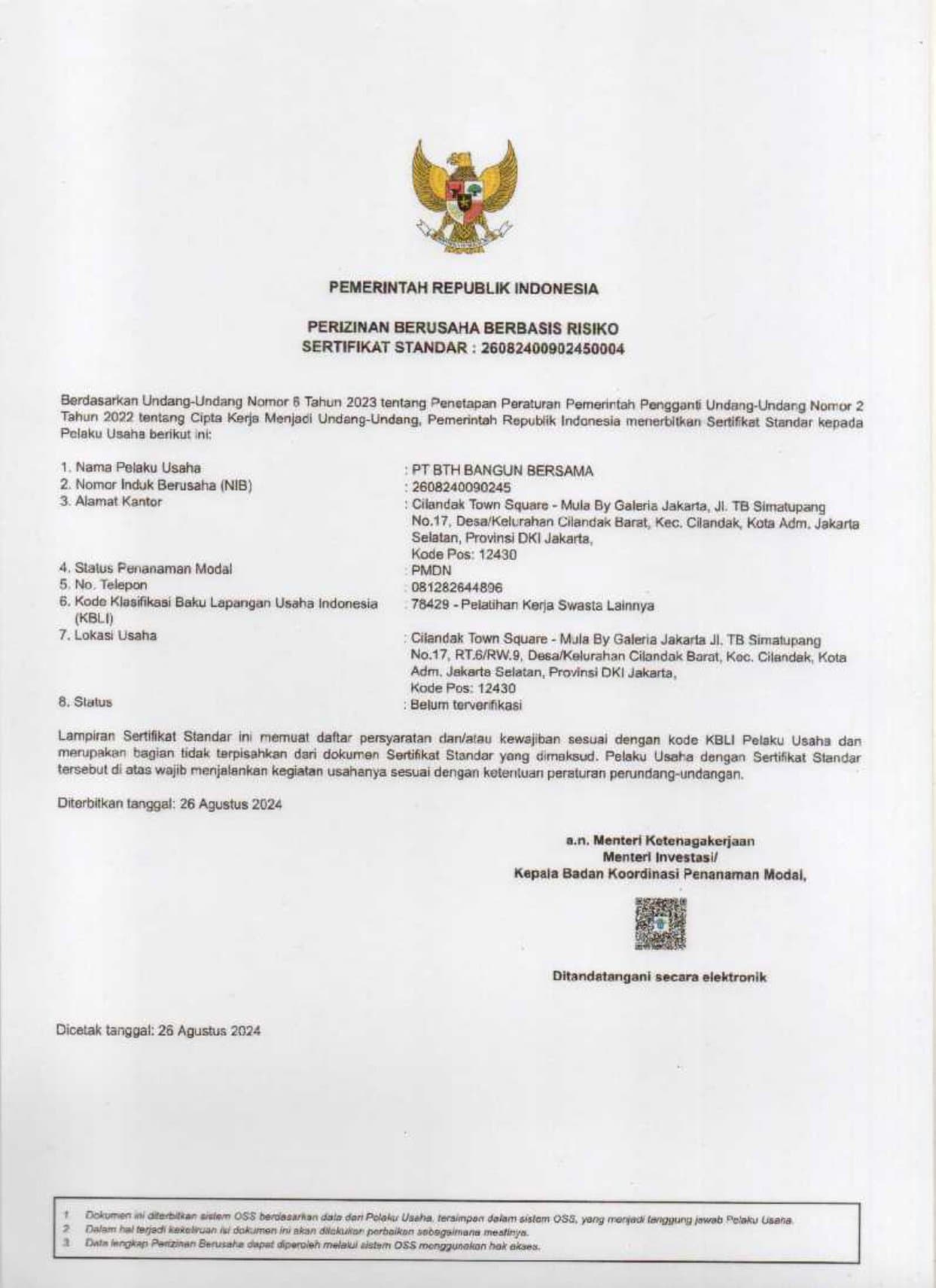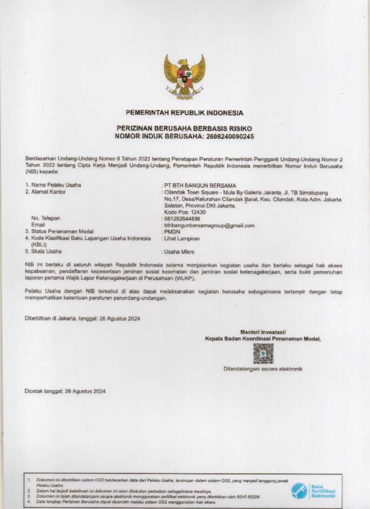 PT. BTH Bangun Bersama adalah perusahaan yang berdiri pada 26 Agustus 2024, dengan semangat untuk menjadi mitra terpercaya dalam berbagai sektor strategis di Indonesia. Kami hadir sebagai entitas yang dinamis dan inovatif, menawarkan layanan professional yang mencakup berbagai bidang usaha mulai dari konstruksi, pelatihan kerja, hinggaperdaganganbesar. Kami mengedepankan integritas, profesionalisme, dan inovasi dalam setiap lini bisnis yang dijalankan, dengan komitmen tinggi untuk memberikan hasilterbaikbagi klien, mitra,dan masyarakat.