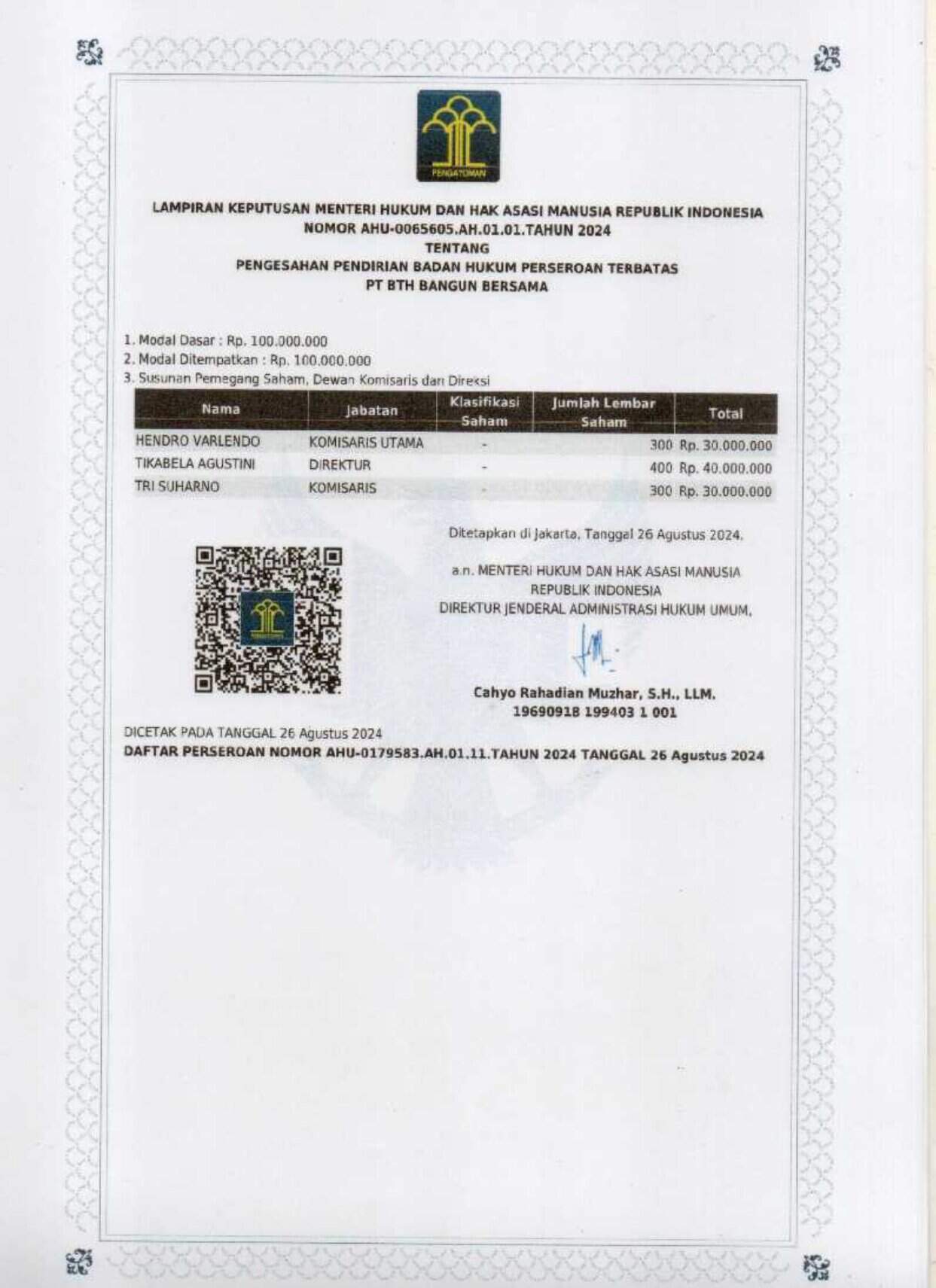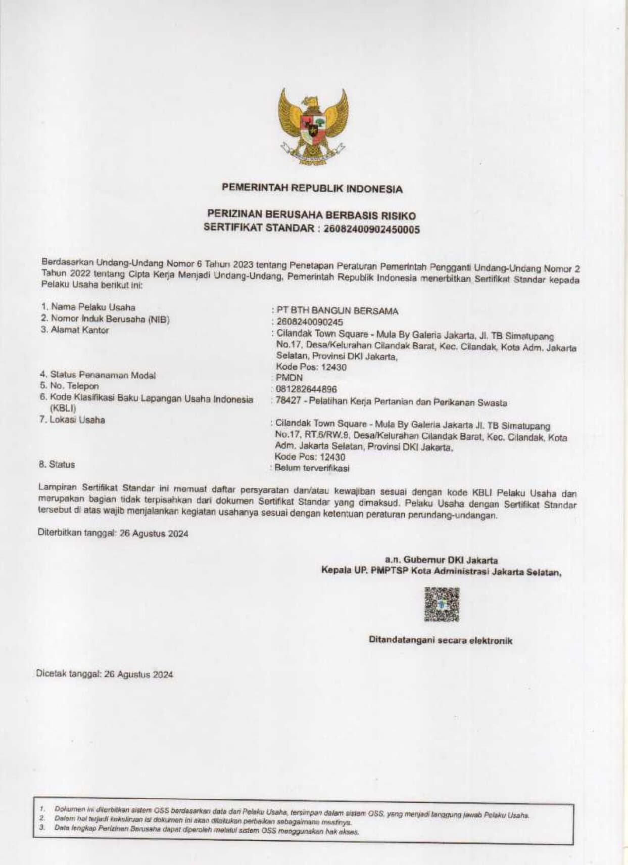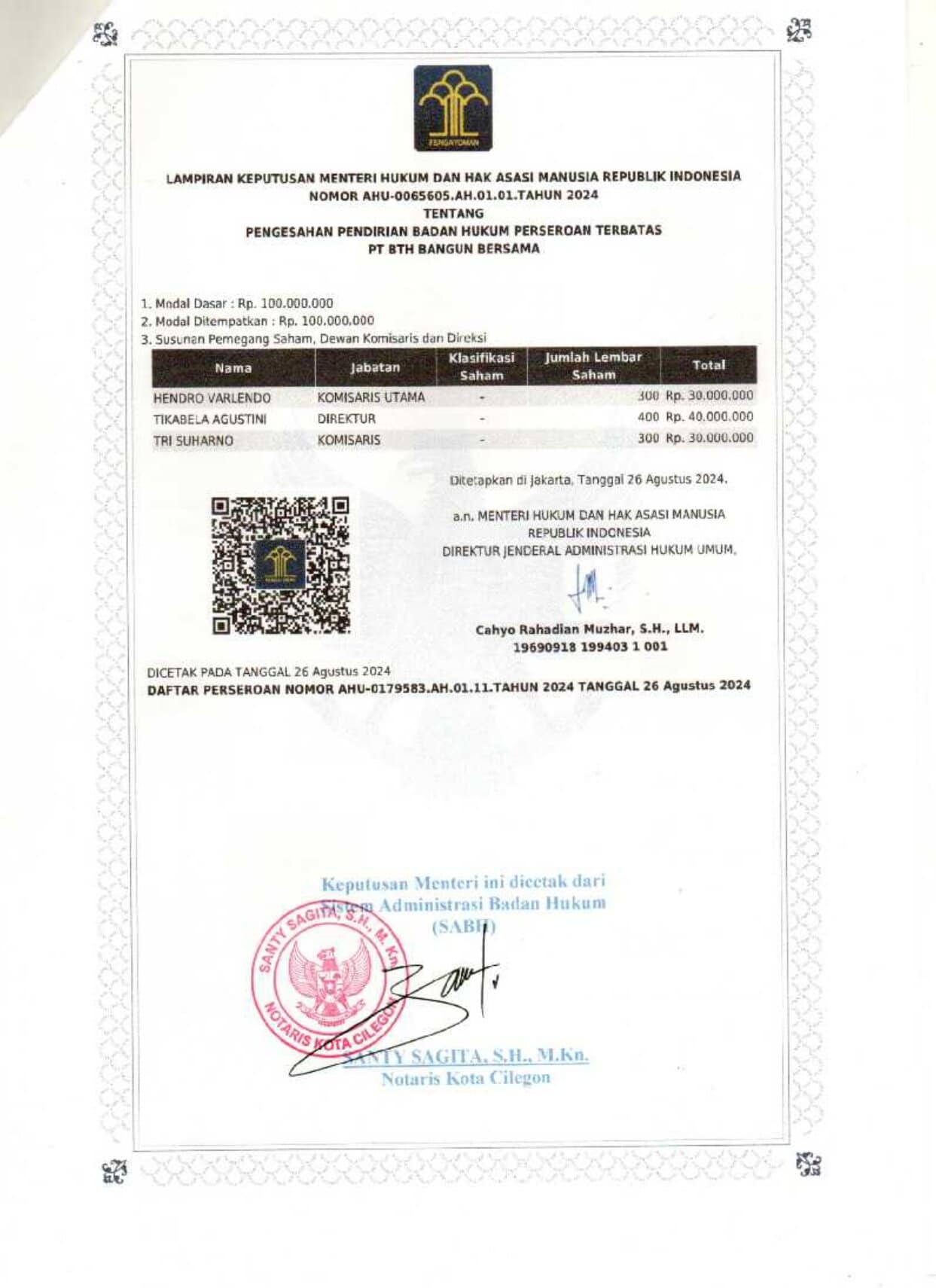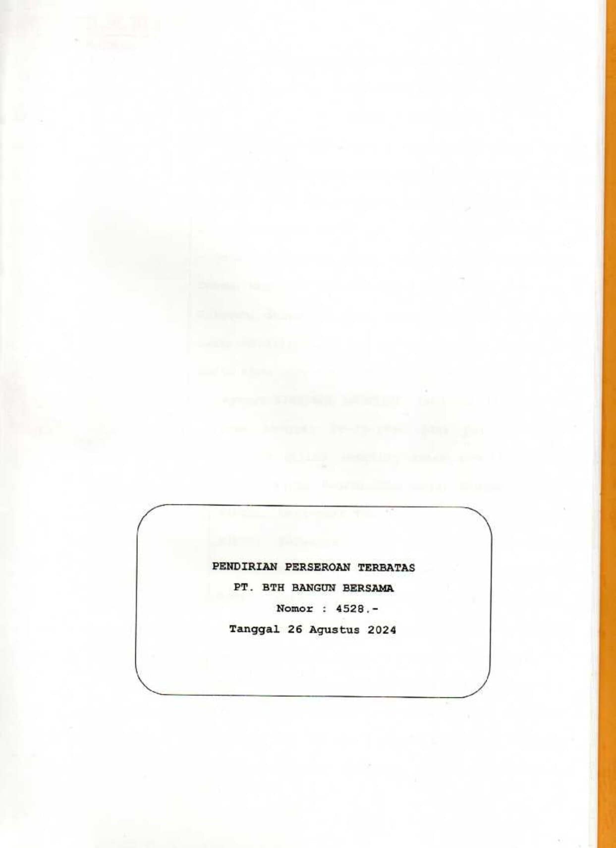 PT. BTH Bangun Bersama adalah perusahaan yang berdiri pada 26 Agustus 2024, dengan semangat untuk menjadi mitra terpercaya dalam berbagai sektor strategis di Indonesia. Kami hadir sebagai entitas yang dinamis dan inovatif, menawarkan layanan professional yang mencakup berbagai bidang usaha mulai dari konstruksi, pelatihan kerja, hinggaperdaganganbesar. Kami mengedepankan integritas, profesionalisme, dan inovasi dalam setiap lini bisnis yang dijalankan, dengan komitmen tinggi untuk memberikan hasilterbaikbagi klien, mitra,dan masyarakat.
